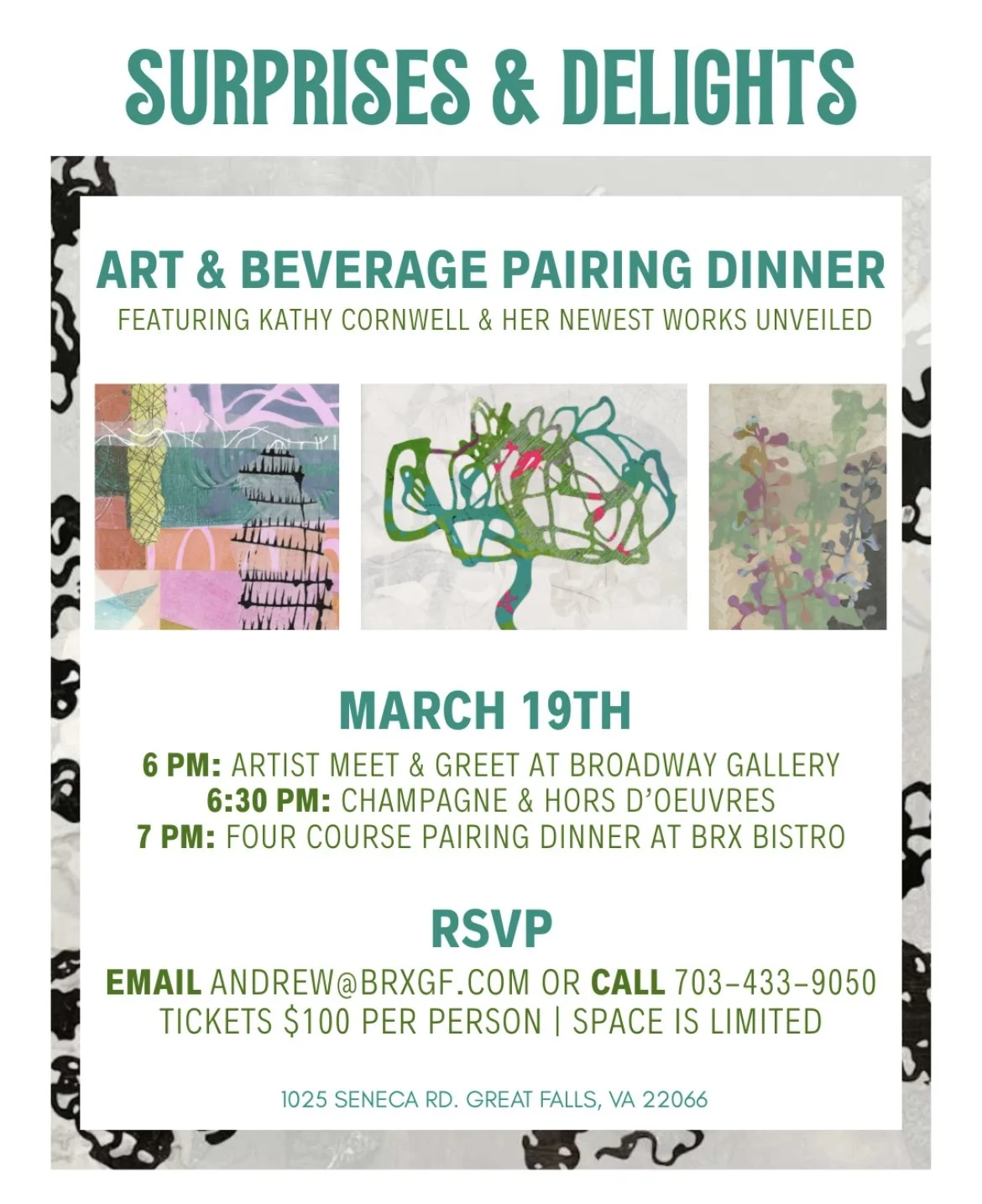 I’m super excited for a collaborative event that’s coming up here in Northern Virginia on March 19, 2026: an evening of surprises and delights, brought to you by me, Broadway Gallery, and BRX American Bistro in Great Falls, Virginia.